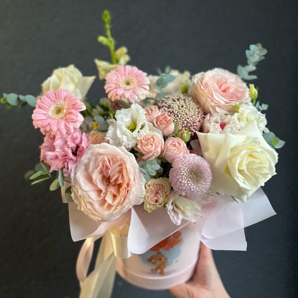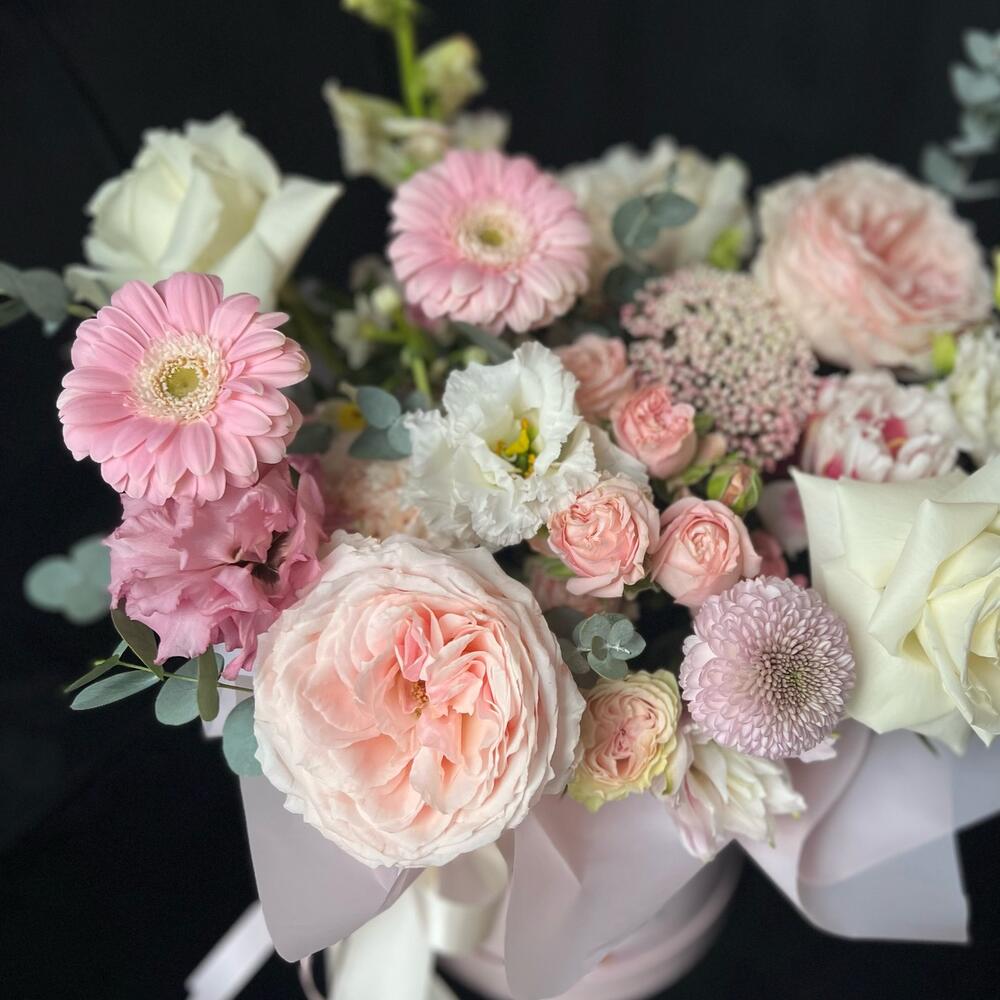 Цветы в коробке из пионовидных роз,Хризантемы и Гербер