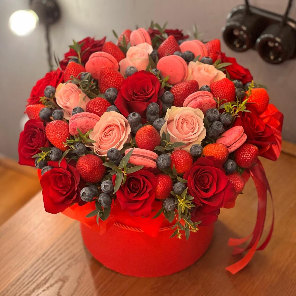 Красивый букет из роз, клубники и пирожных макаронс на день рождения, сестре, подруге, маме, бабушке или просто так, в стильной упаковке . Идеальный подарок на любое торжество. Коробочка с цветами и вкусностями подойдет юной девушке или взрослой даме. Красивый букет в коробке смотрится очень романтично , чтобы цветы в коробке простояли долго доливайте воду в оазис. К букету вы можете выбрать воздушные шары, топер, открытку. Мы подпишем открытку и вовремя доставим адресату.Ягоды перед употреблением необходимо мыть.
