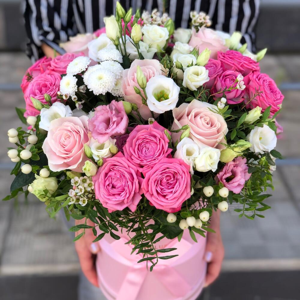 Гиперикум – 5 шт. Писташ – 5 шт. Роза – 7 шт. Хризантема – 1 шт. Эустома – 5 шт. Хамелациум – 3 шт. Кустовая пионовидная роза – 4 шт. Шляпная коробка с лентами – 1 шт.