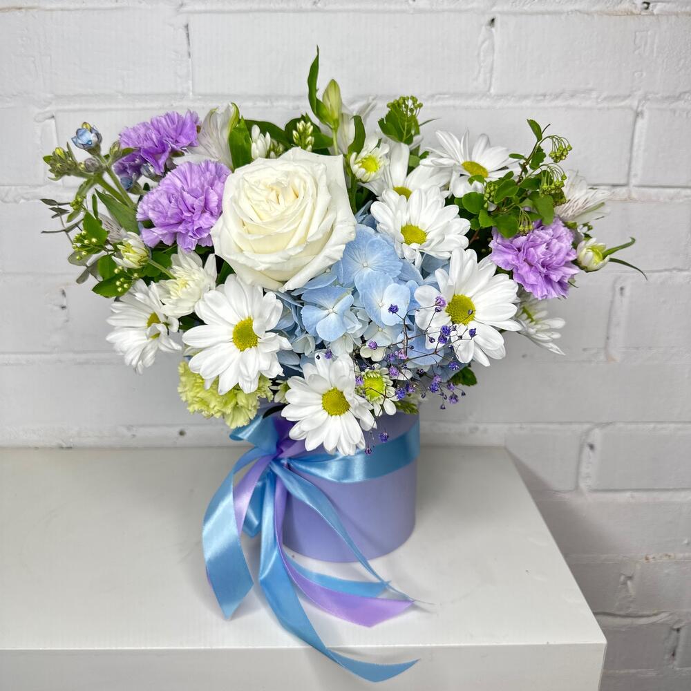 Хризантема кустовая – 3 шт.Диантус – 3 шт.Роза Эквадор – 1 шт.Гортензия – 1 шт.Фисташка – 3 шт.Оазис флористический – 1 шт.Шляпная коробка с лентами – 1 шт.