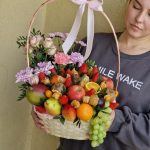 Клубника – 250 гр.Корзина – 1 шт.Гвоздика – 1 шт.Киви – 2 шт.Яблоко – 2 шт.Апельсин – 1 шт.Мандарин – 3 шт.Физалис – 50 гр.Груша – 2 шт.Слива – 2 шт.манго – 1 шт.Нектарин – 2 шт.Виноград гроздь – 1 шт.декоративная зелень – 2 шт.хризантема ветка – 1 шт.роза кустовая ветка – 1 шт.