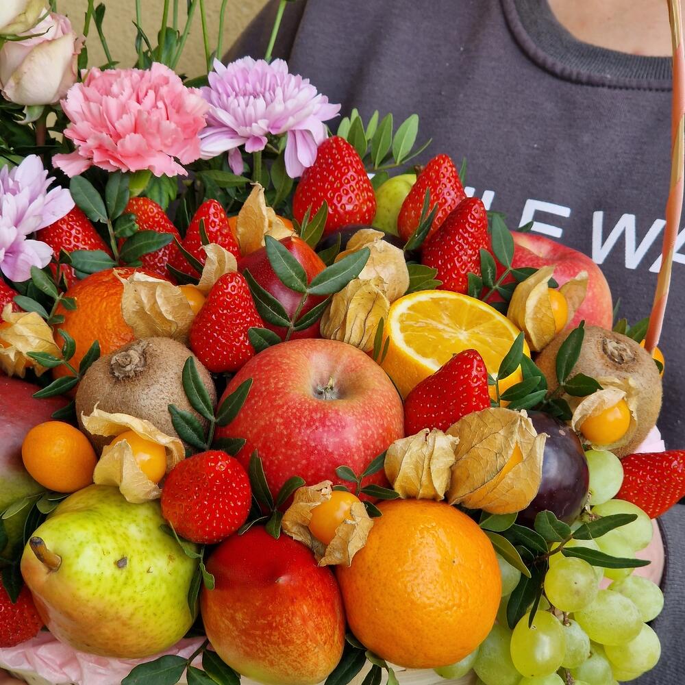 Корзина , в которой прекрасно сочетаются фрукты , ягоды и цветочная композиция.