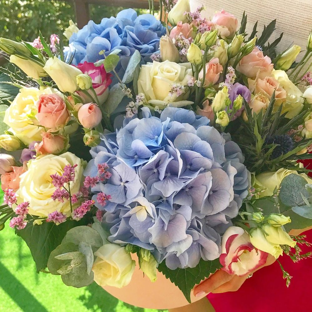 Гортензия Боденси Блю – 2 шт.Роза белая – 7 шт.Роза кустовая – 5 шт.Лимониум Диаманд Пинк – 2 шт.Лизиантус микс – 5 шт.Шляпная коробка – 1 шт.