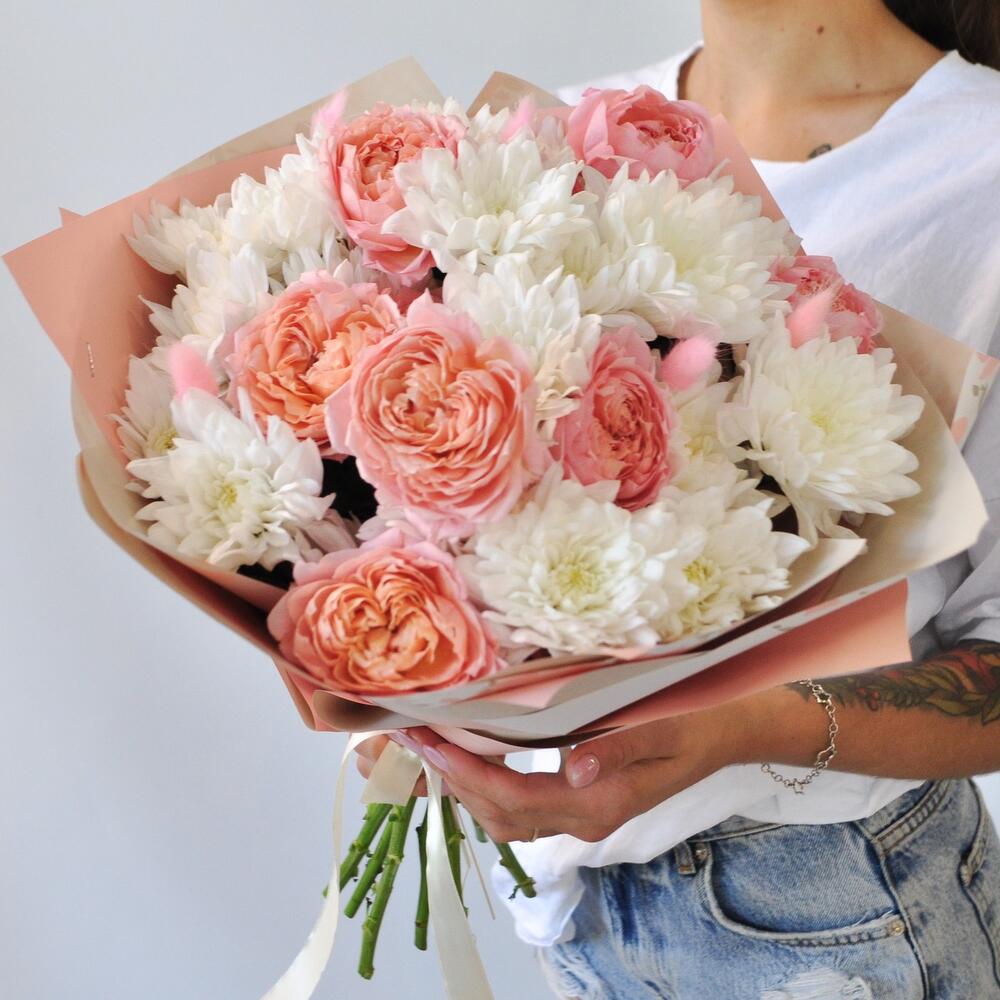 Хризантема и розы Джульетта в нежном букете