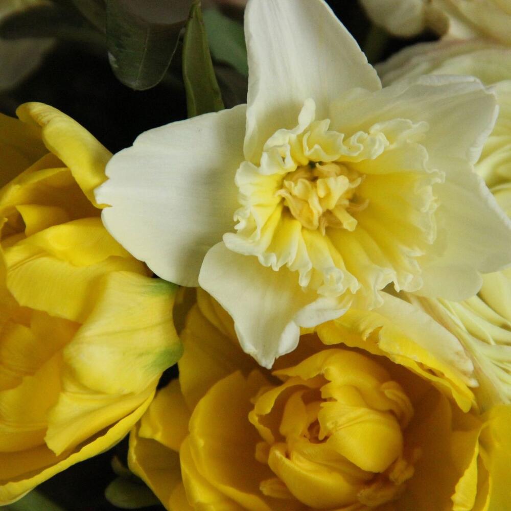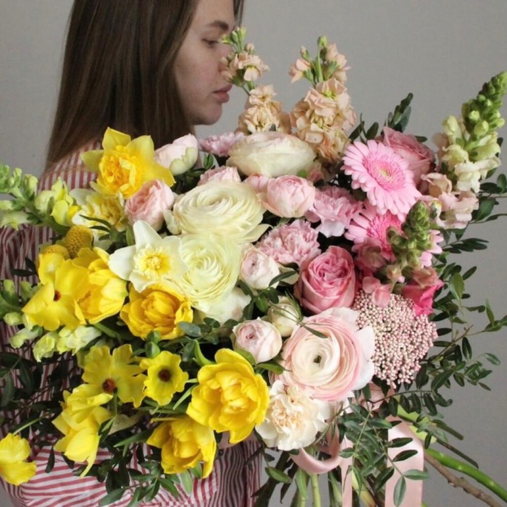 Тюльпан сортовой – 5 шт.Нарцисс – 5 шт.лютик ранункулюс – 3 шт.Роза кустовая пионовидная – 3 шт.Ранункулюс – 5 шт.Гвоздика – 7 шт.Озотамнус – 3 шт.Маттиола – 3 шт.Львиный зев – 5 шт.Краспедия – 3 шт.Эвкалипт – 5 шт.Лента – 2 шт.