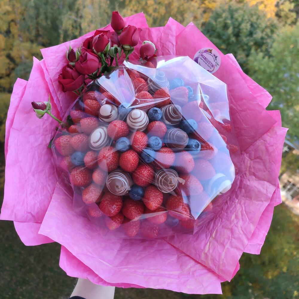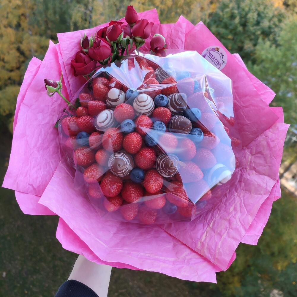 Клубника – 700 гр.Кустовая роза – 2 шт.клубника в бельгийском шоколаде – 200 гр.