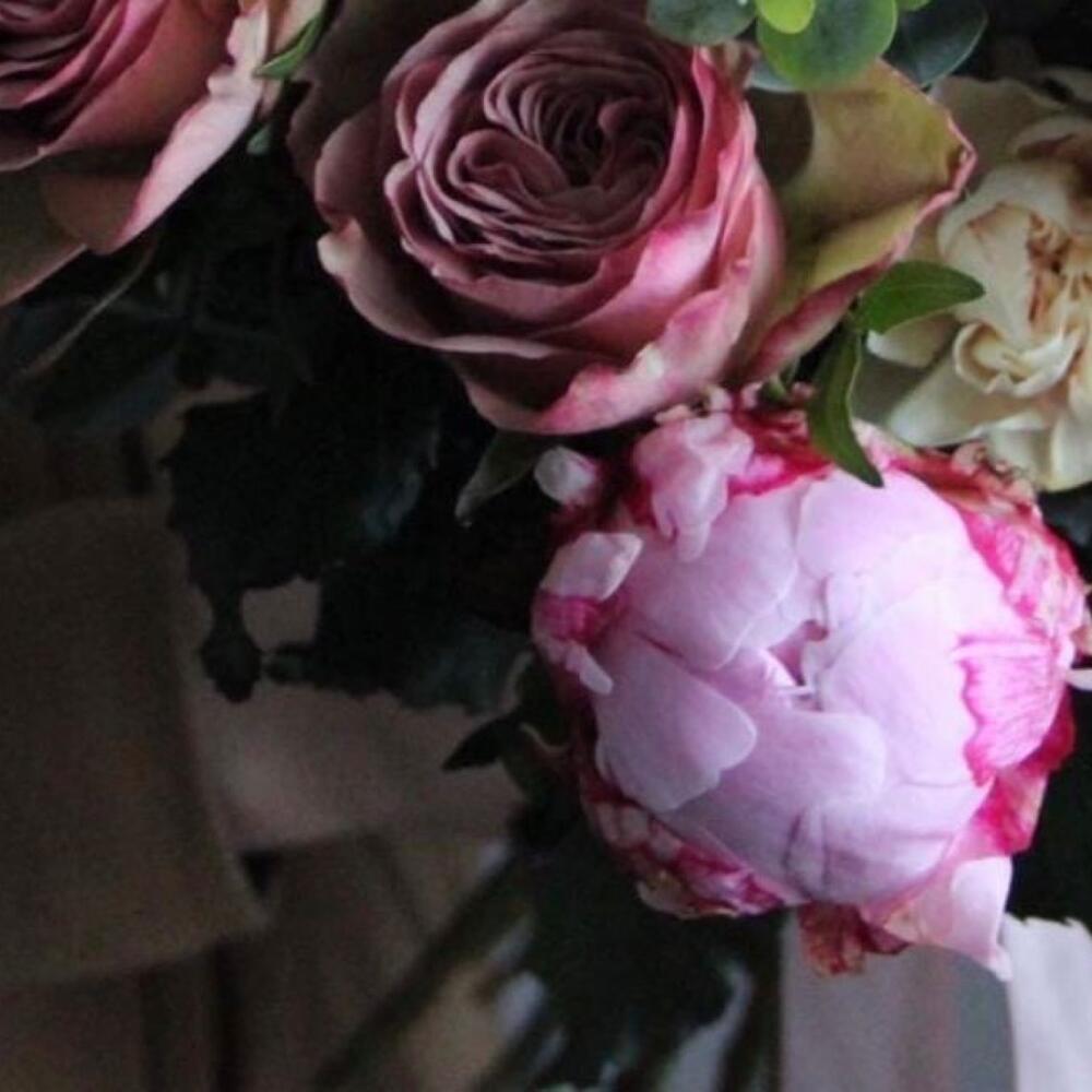 Пион – 4 шт.роза тоффи – 4 шт.Роза сортовая – 5 шт.Роза кустовая пионовидная – 2 шт.Лизиантус – 3 шт.Диантус – 3 шт.Эвкалипт – 7 шт.Лента – 1 шт.