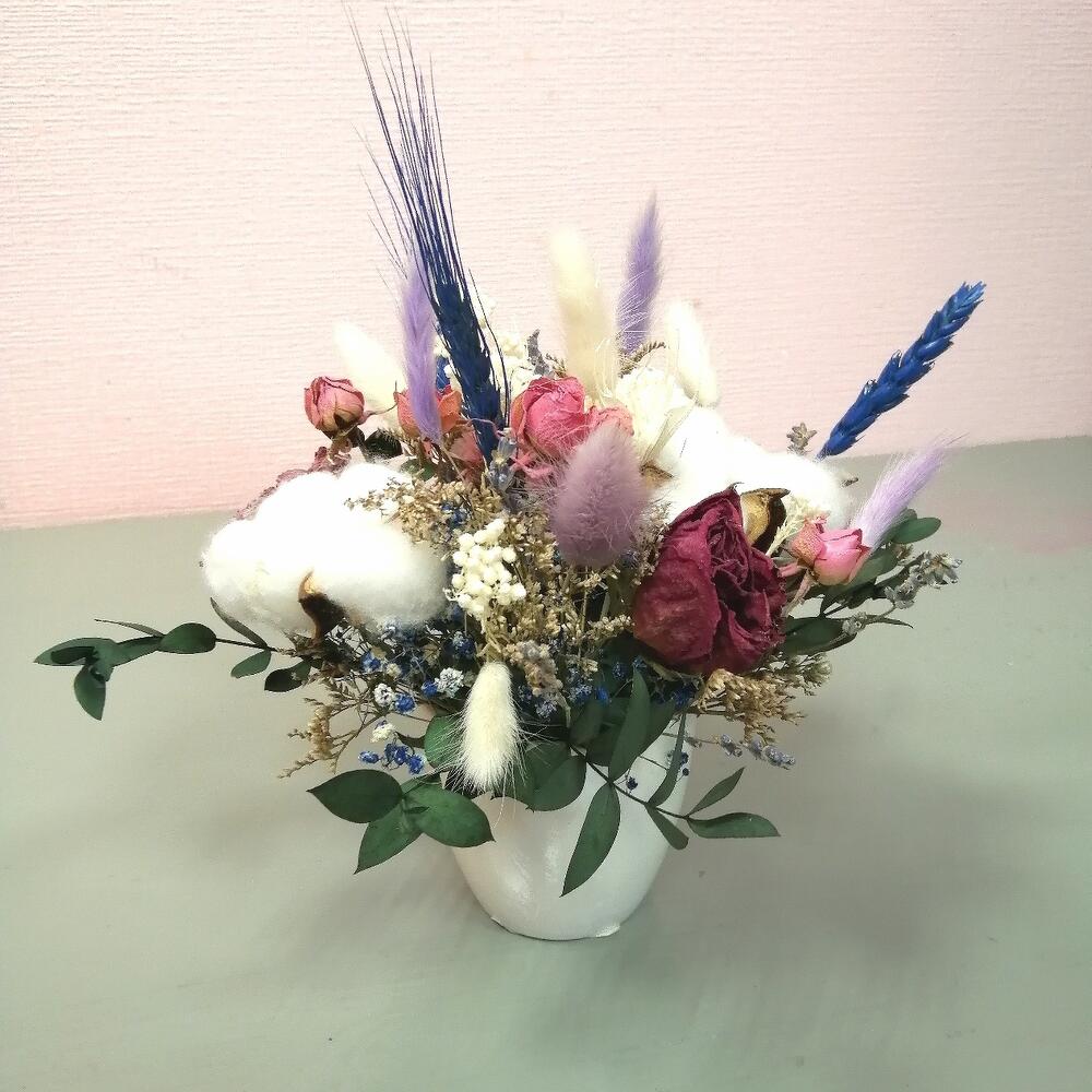 Лагурус – 8 шт.Колосья – 3 шт.озотамнус стабилизированный – 2 шт.Хлопок натуральный – 2 шт.Эвкалипт – 1 шт.Роза кустовая сухоцвет – 1 шт.гипсофила радужная – 1 шт.зелень декоративная – 6 шт.Оазис флористический – 1 шт.Кашпо керамическое – 1 шт.