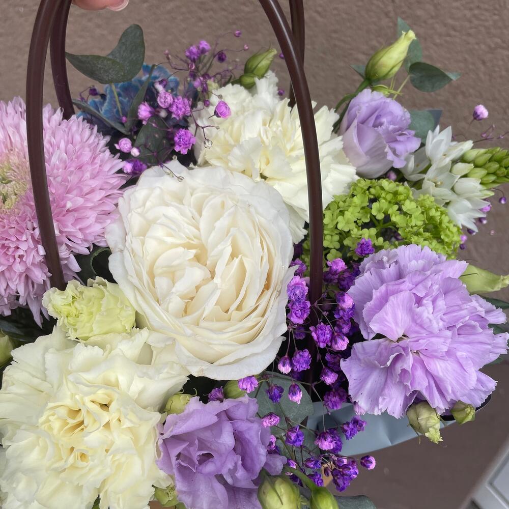 Роза пионовидная – 1 шт.Орнитогалум – 1 шт.Диантус – 4 шт.Эустома – 1 шт.Хризантема – 1 шт.Гипсофила – 1 шт.Эвкалипт – 1 шт.Фисташка – 1 шт.Оазис флористический – 1 шт.Упаковка – 1 шт.Сумка крафт – 1 шт.