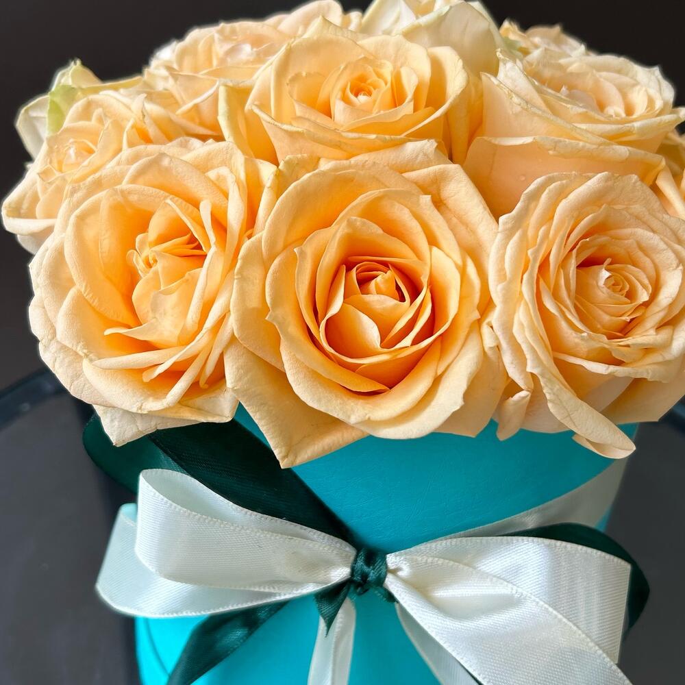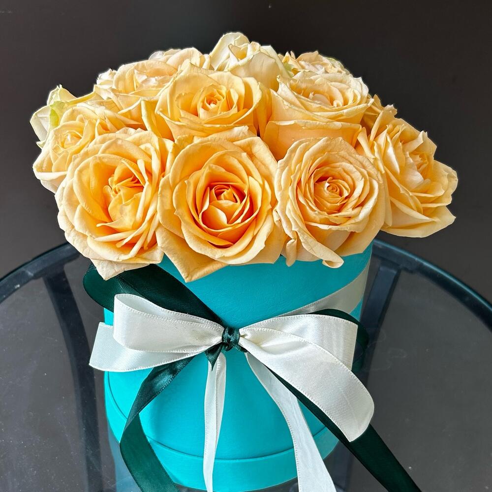 Композиция в коробке из 15 персиковых роз и ароматного эвкалипта
