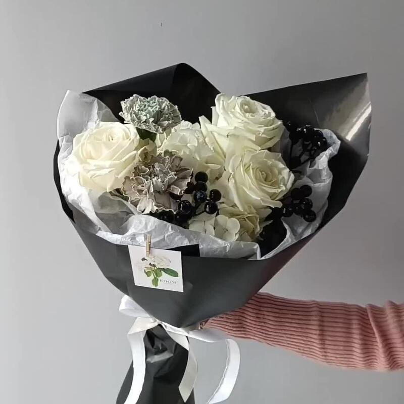 Гортензия – 1 шт.Роза одноголовая – 3 шт.Гвоздика сортовая – 2 шт.Декоративная ягода – 3 шт.Упаковка дизайнерская – 1 шт.