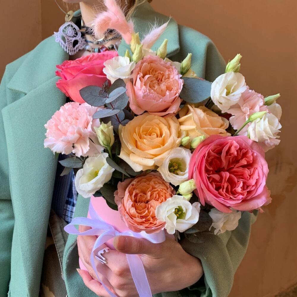 Эвкалипт – 2 шт.Гвоздика розовая – 3 шт.Коробка шляпная – 1 шт.Оазис – 1 шт.Лизиантус белый – 1 шт.джульетта – 1 шт.Лагурус розовый – 3 шт.роза пинк экспрешн – 3 шт.роза персиковая россия – 4 шт.