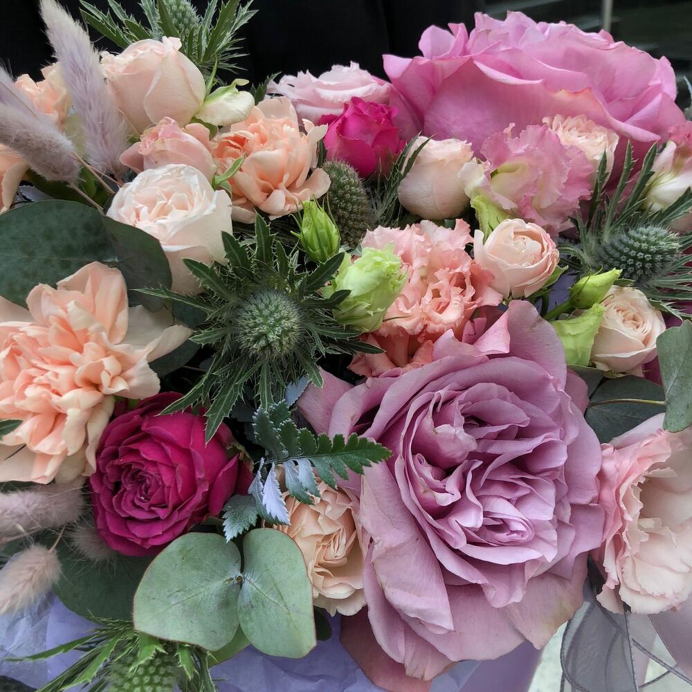 Роза пионовидная – 3 шт.Лизиантус – 3 шт.Роза бомбастик кустовая премиум – 3 шт.Гвоздика – 3 шт.роза мисти бабл пионовидная – 1 шт.Эрингиум – 1 шт.папопотник – 4 шт.Коробка – 1 шт.Оазис флористический – 2 шт.