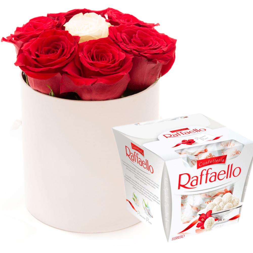 Роза красная – 6 шт.Роза белая – 1 шт.Оазис – 1 шт.Шляпная коробка – 1 шт.конфеты raffaello 150 гр. – 1 шт.