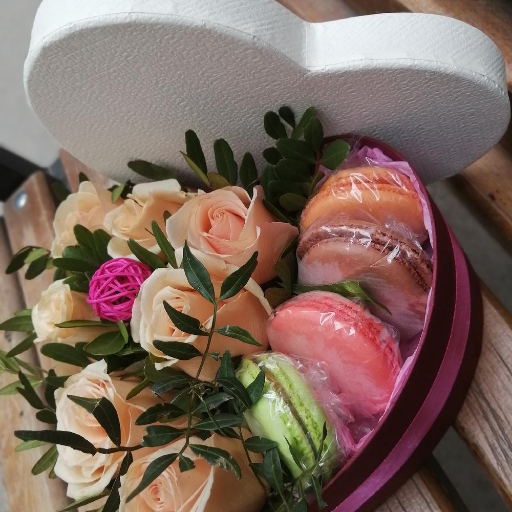 Роза – 7 шт.Зелень – 1 шт.Коробка – 1 шт.Оазис флористический – 1 шт.Макарон – 4 шт.