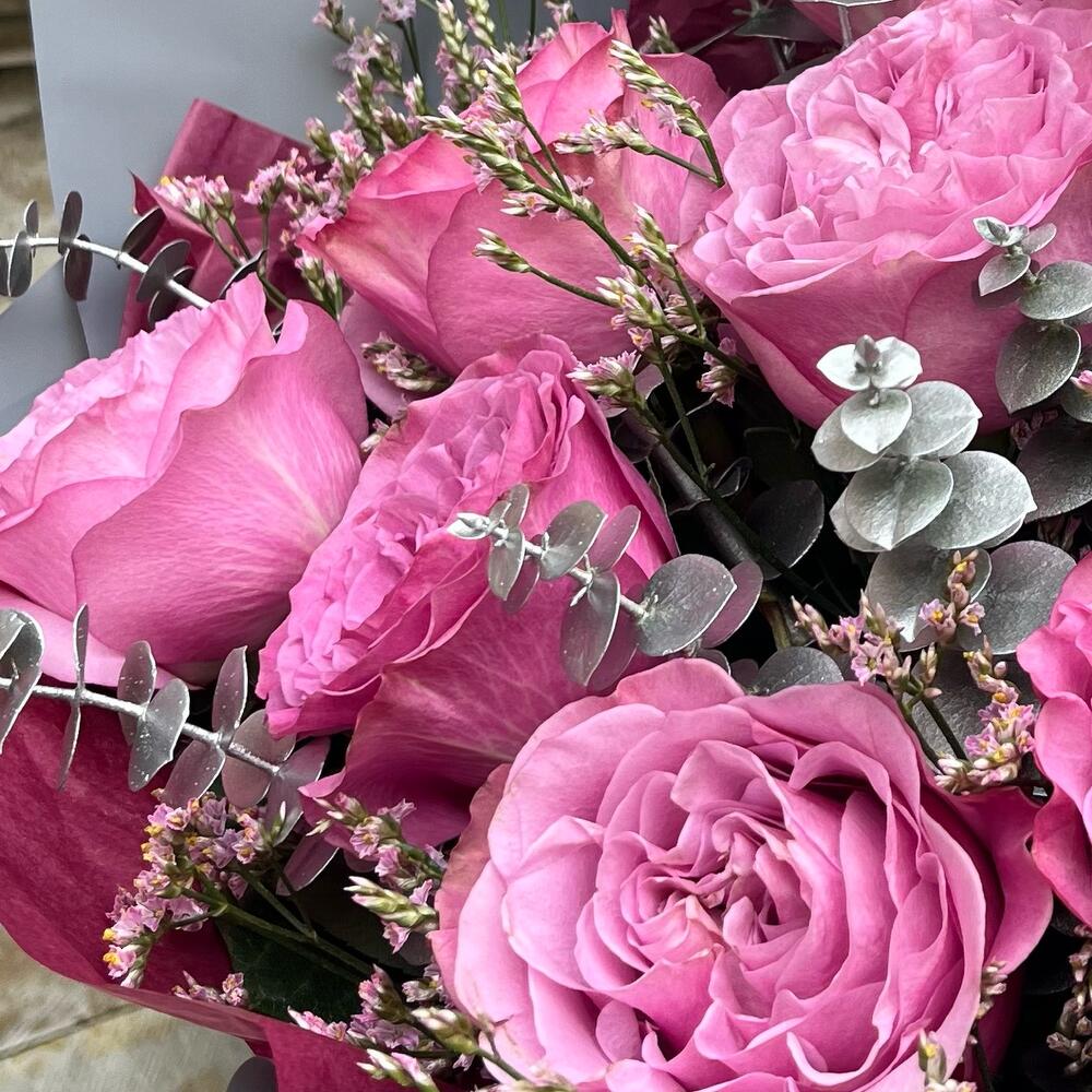Лента атласная – 2 шт.Тишью – 2 шт.Лимониум розовый – 3 шт.Упаковка корейская пленка – 1 шт.роза премиум queens krown – 9 шт.