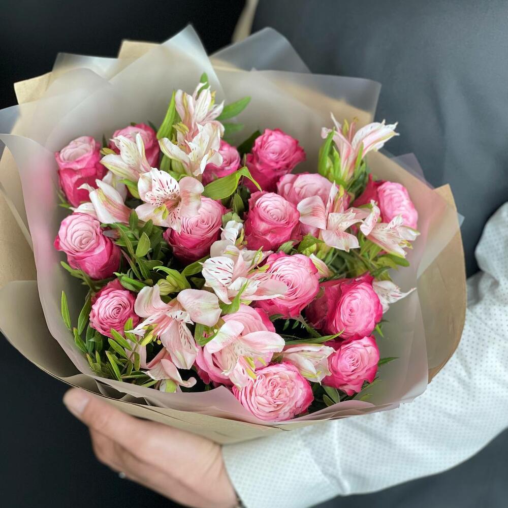 Роза – 15 шт.Альстромерия – 3 шт.Фисташка – 3 шт.Крафт – 3 шт.