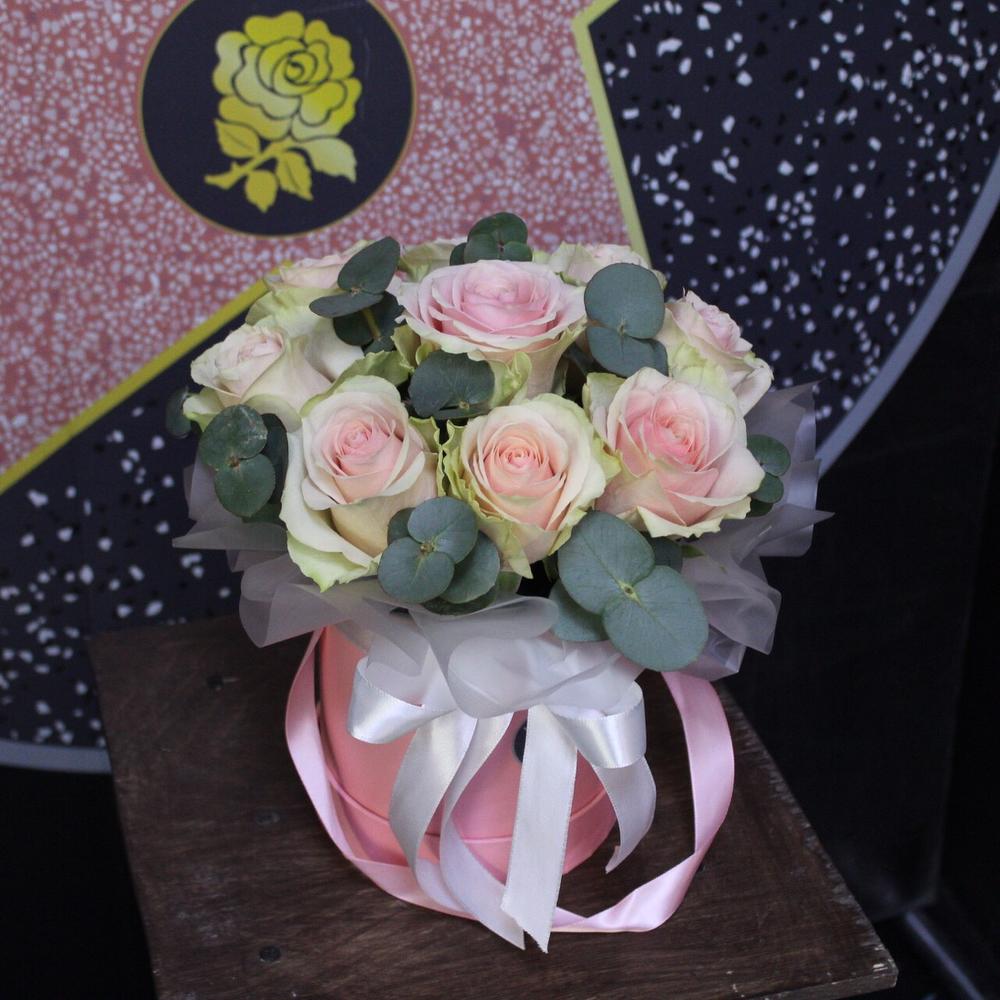 роза фруттето – 9 шт.Эвкалипт – 3 шт.Пленка дизайнерская – 1 шт.Оазис флористический – 1 шт.Шляпная коробка – 1 шт.Лента атласная – 1 шт.