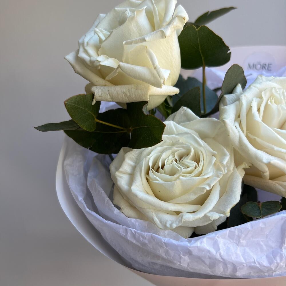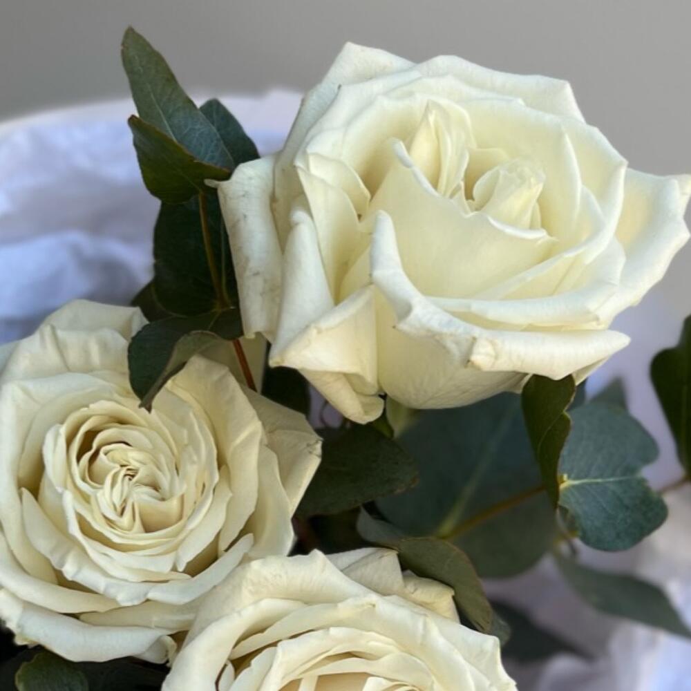 Милый мини букет из 3 белых роз и эвкалипта