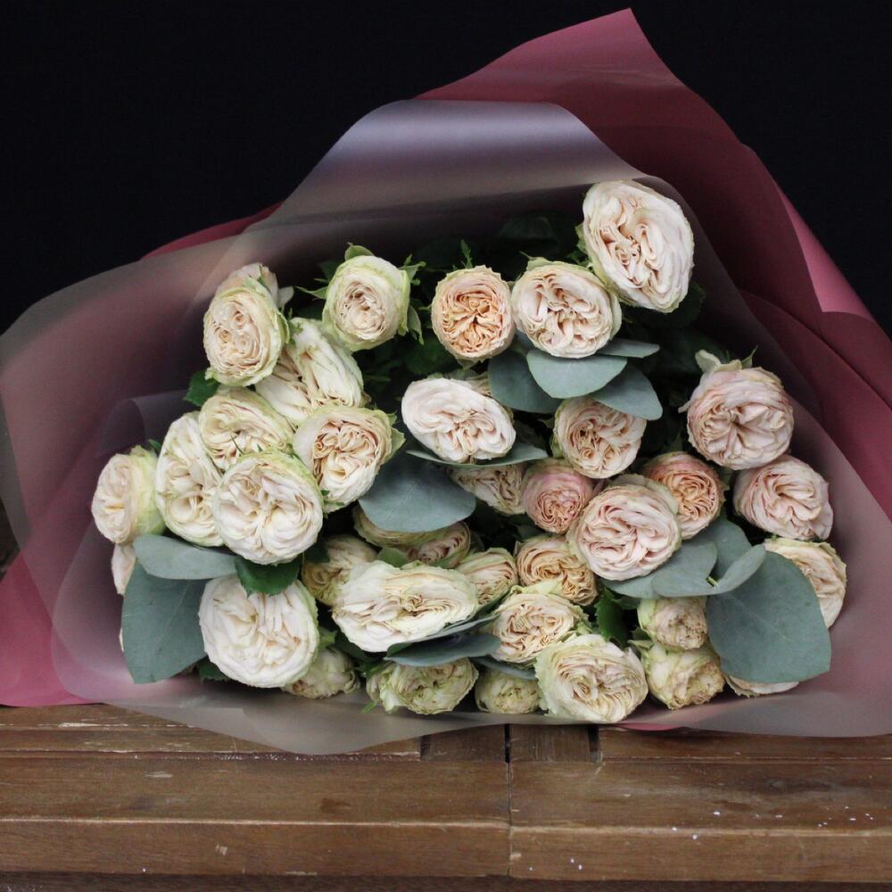 mono bouquet 114 из 7 кустовых пионовидных роз сорта trendsetter с эвкалиптом