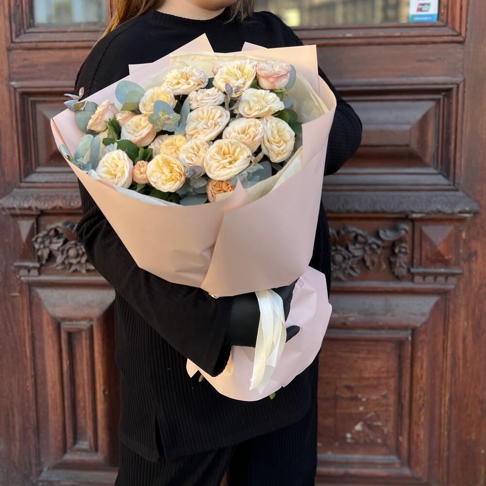 Эвкалипт – 5 шт.Лента атласная – 2 шт.Тишью – 3 шт.Пленка матовая – 5 шт.роза пионовидная кустовая трендсеттер – 5 шт.
