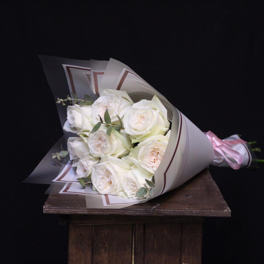Эвкалипт – 2 шт.Пленка дизайнерская – 2 шт.роза пионовидная white o’hara – 9 шт.
