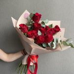 Роза – 11 шт. Эвкалипт – 3 шт. Упаковка – 1 шт. Атласная лента – 1 шт.