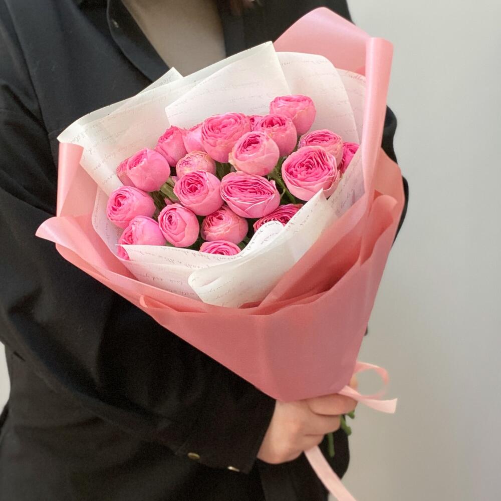 Роза пионовидная кустовая – 5 шт.Упаковка дизайнерская – 2 шт.Лента атласная – 1 шт.