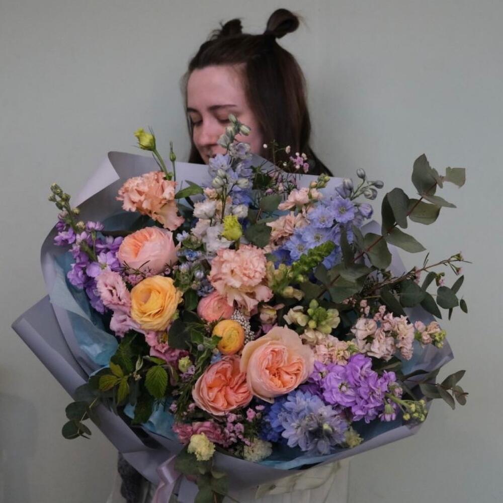 Роза пионовидная – 5 шт.Ранункулюс – 5 шт.Дельфиниум – 5 шт.Маттиола – 3 шт.Эустома – 3 шт.Ваксфлауэр – 2 шт.Озотамнус – 2 шт.Эвкалипт – 5 шт.Львиный зев – 3 шт.Упаковка – 1 шт.