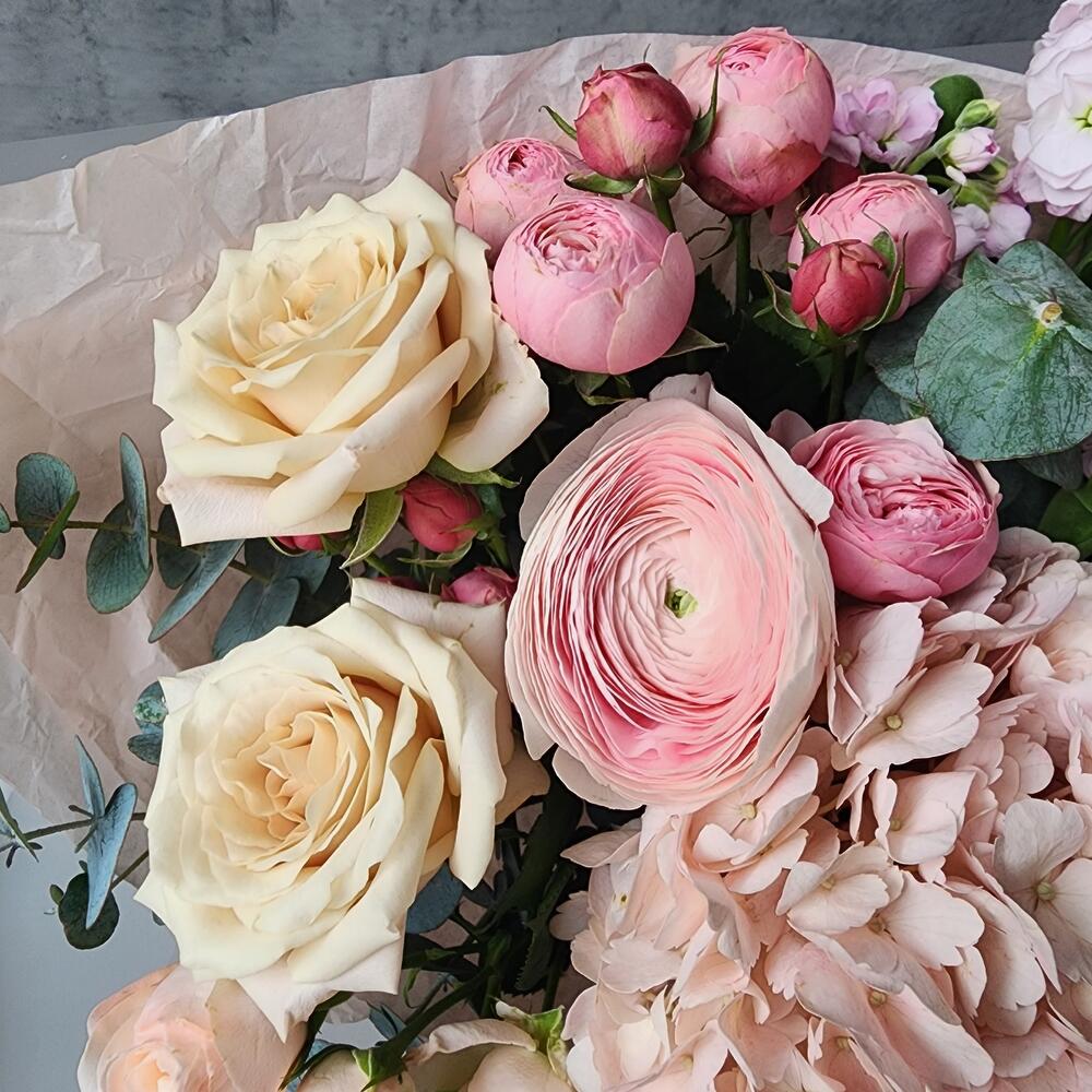 Эвкалипт – 4 шт.Роза Мента – 3 шт.Упаковка дизайнерская – 3 шт.Гортензия розовая – 1 шт.Кустовая пионовидная роза Бомбастик – 4 шт.Ранункулюс ханой – 1 шт.маттиола кустовая розовая – 1 шт.