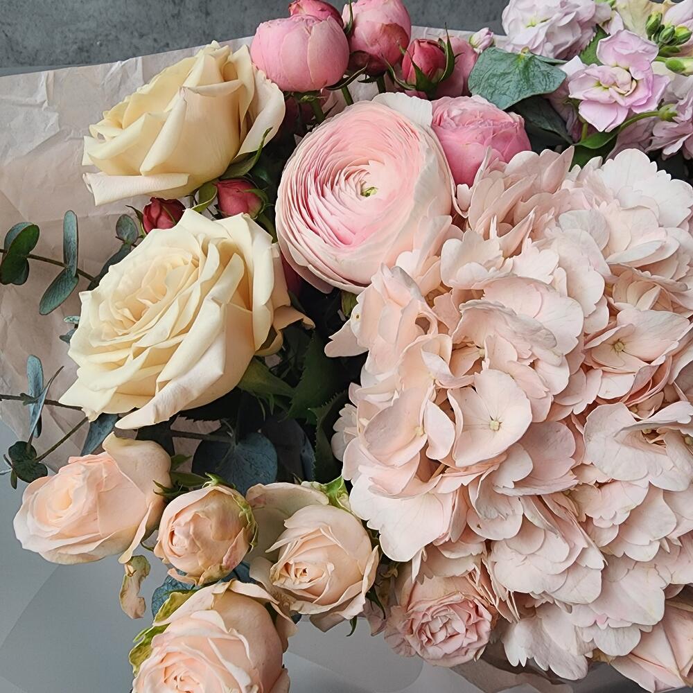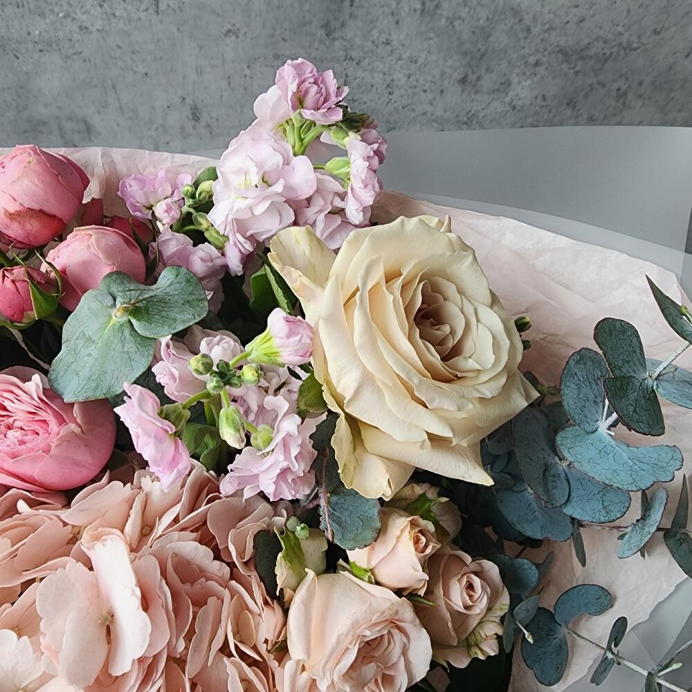 Нежный букет из гортензии, маттиолы, кустовой пион розы Бомбастик и розы Мента с эвкалиптом