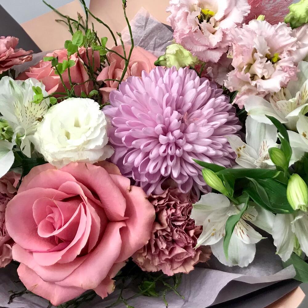 Категорий: Альстромерии, Гвоздики, Лизиантусы, Розы, Хризантемы