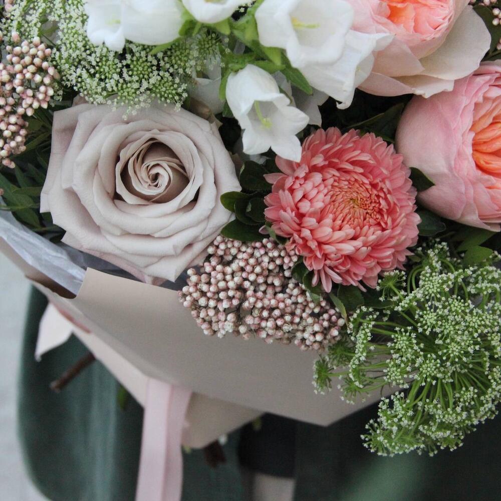 Авторский букет с английскими розами, зонтиками, колокольчиками, астрами и озотамнусом.Стильное цветочное решение для любого случая.