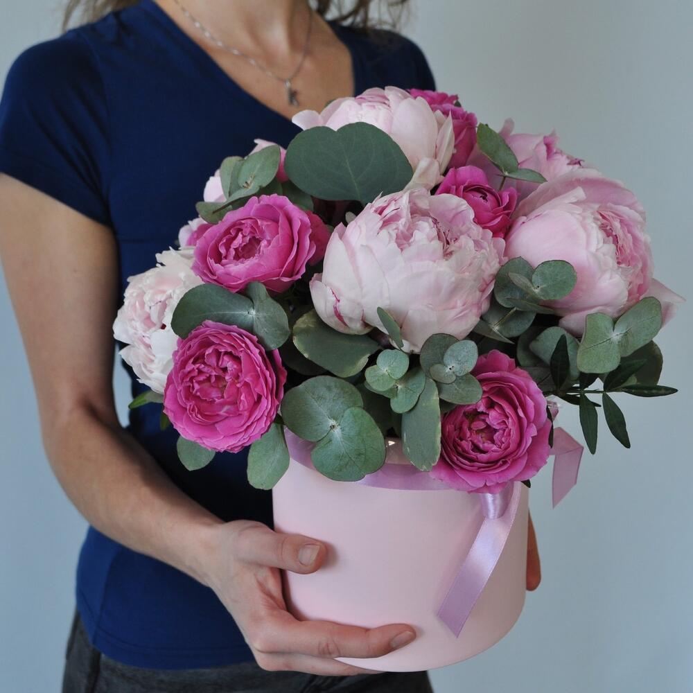 Эвкалипт – 5 шт.Лента атласная – 1 шт.Коробка шляпная – 1 шт.Роза кустовая пионовидная – 4 шт.Оазис флористический – 1 шт.пион розовый ароматный – 7 шт.