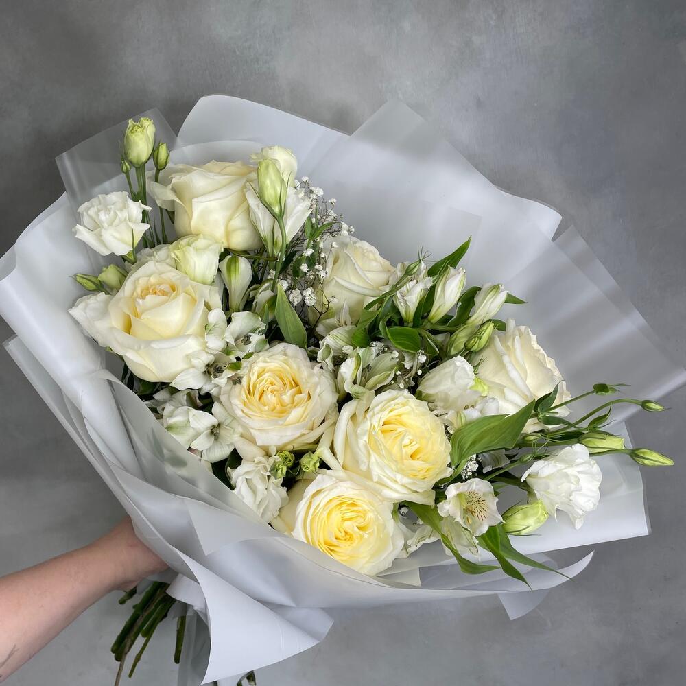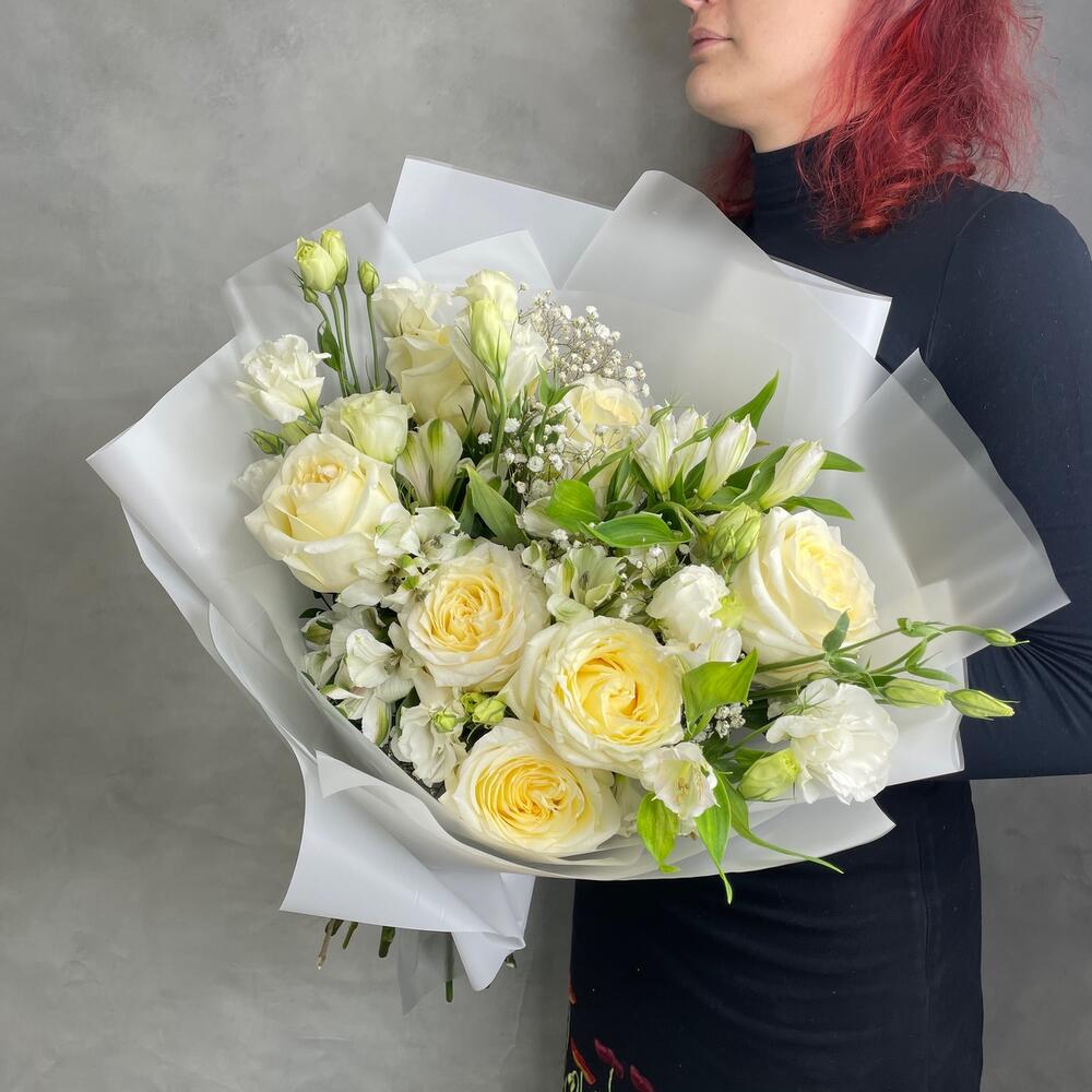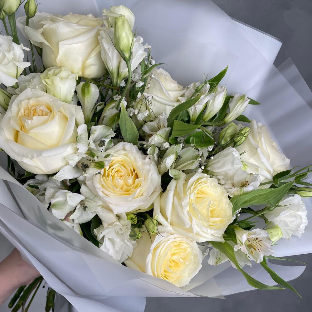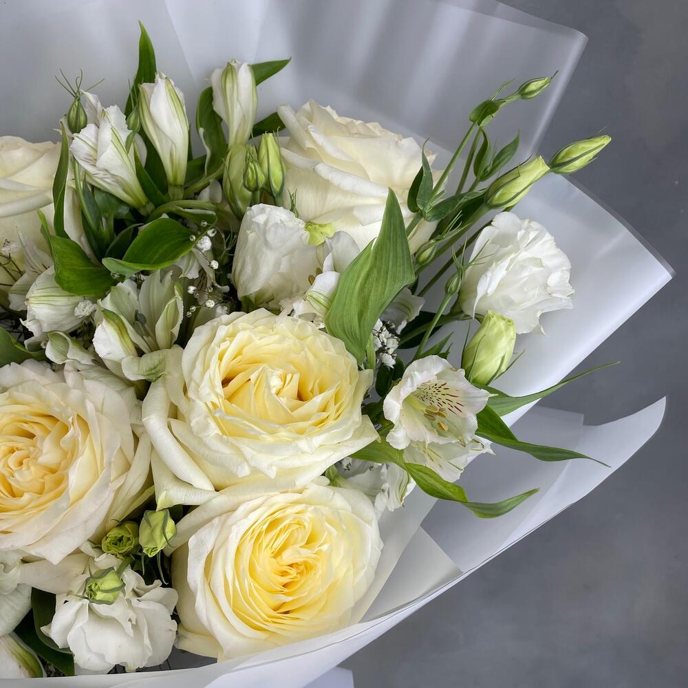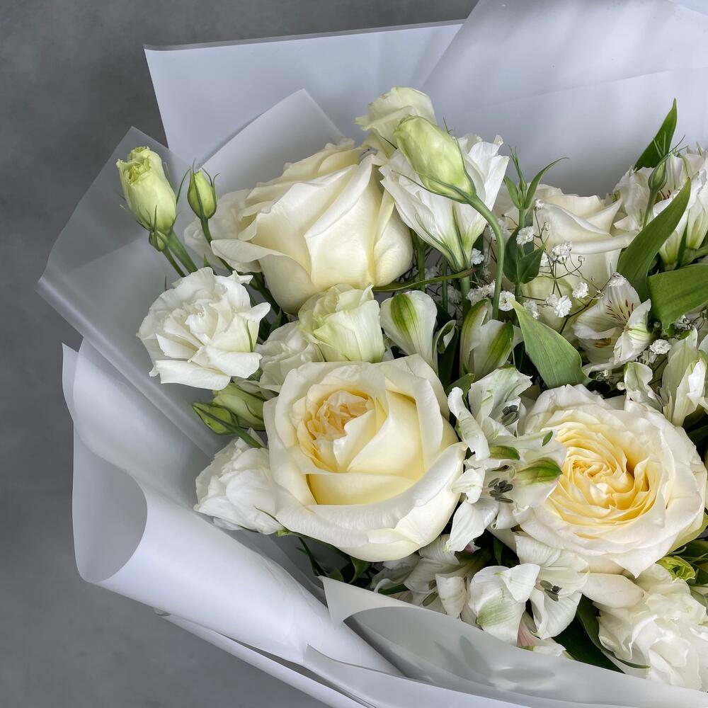 Альстромерии, Гвоздики, Кустовые розы, Лизиантусы, Розы, Хризантемы