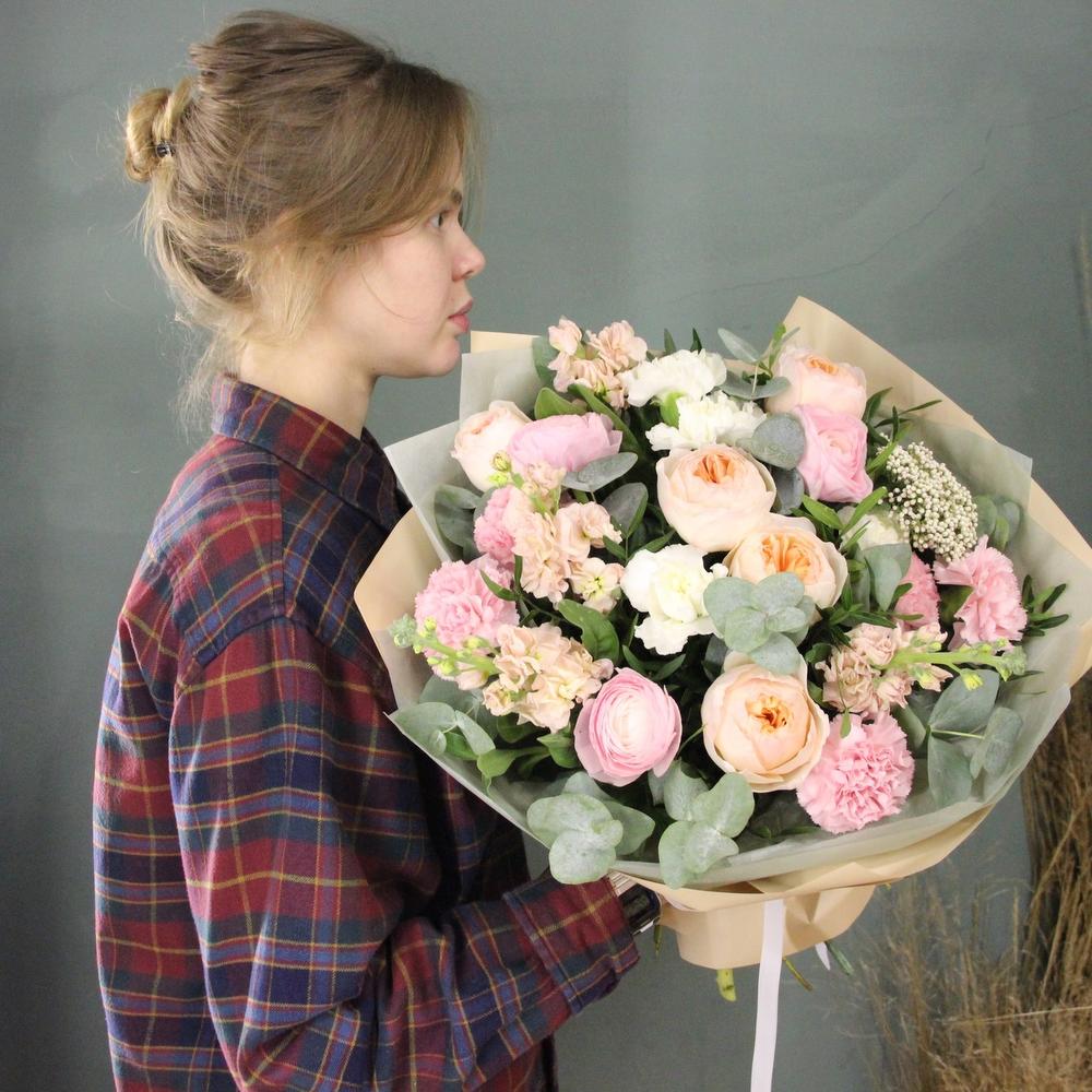 Нежный букет с английскими пионовидными розами, душистой маттиолой, эвкалиптом, озотамнусом и гвоздиками.