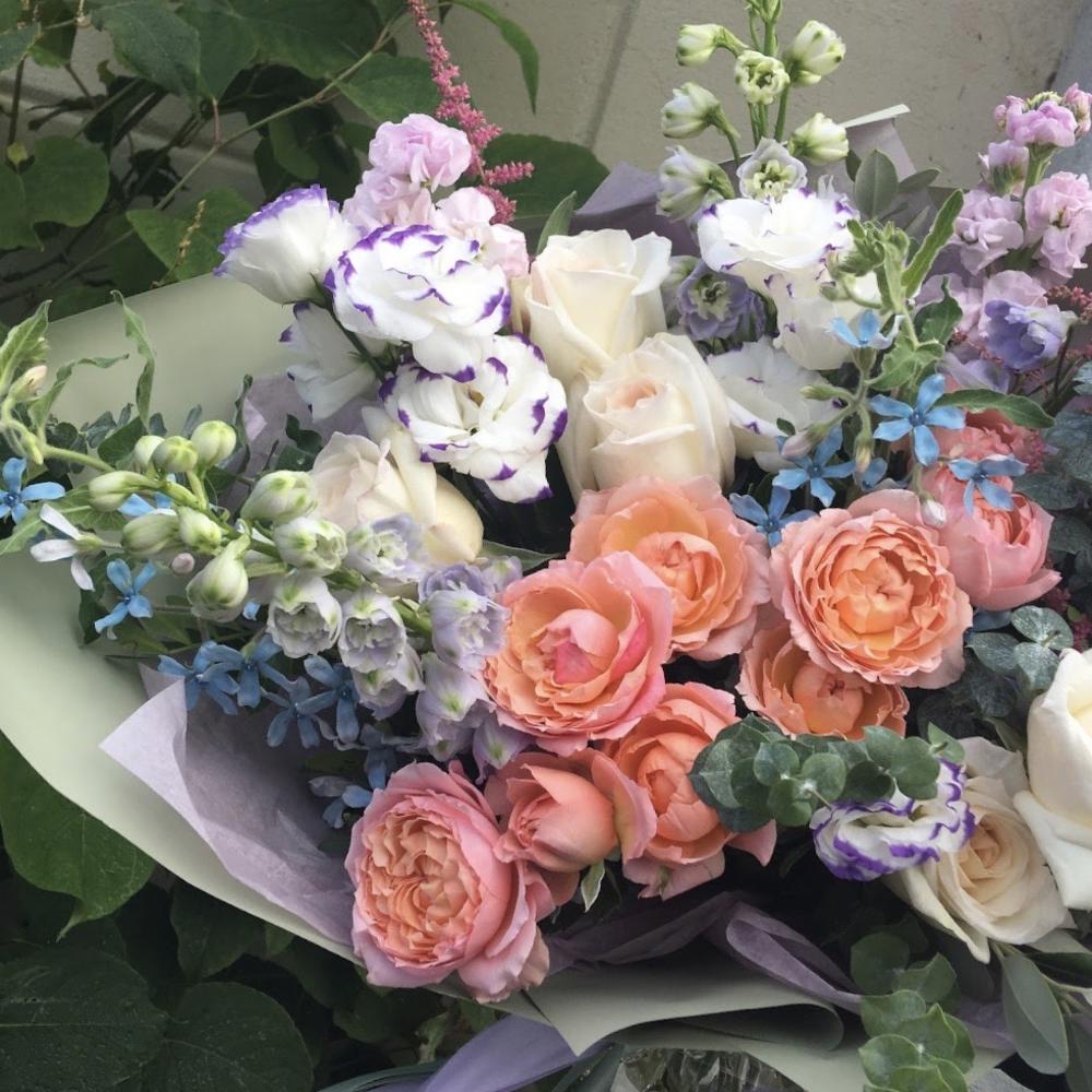 Роза пионовидная кустовая – 3 шт.Роза пионовидная – 7 шт.Дельфиниум – 3 шт.Маттиола – 3 шт.Лизиантус – 4 шт.Астильба – 3 шт.Твидия – 3 шт.Эвкалипт – 7 шт.Упаковка – 2 шт.Тишью – 2 шт.Лента атласная – 2 шт.