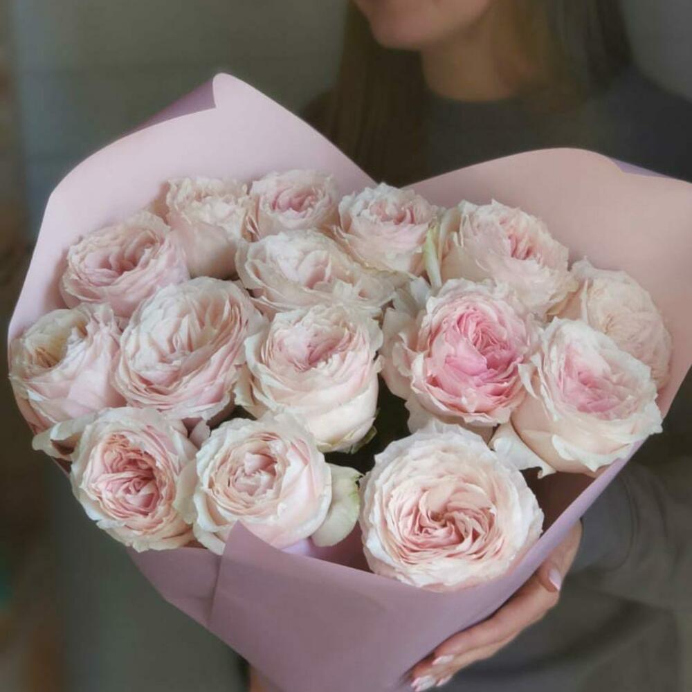 15 садовых роза сорта Tsumugiс (Тсумуги) в моно-букетеСадовая роза это про тончайшие кружевные лепестки и потрясающе красивое раскрытие бутонаБукет оформлен упаковкой и атласными лентами