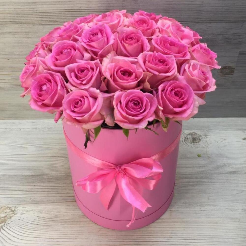 Лента атласная – 1 шт.Оазис флористический – 1 шт.шляпная коробка в ассортименте – 1 шт.розы розовые 40 см – 25 шт.