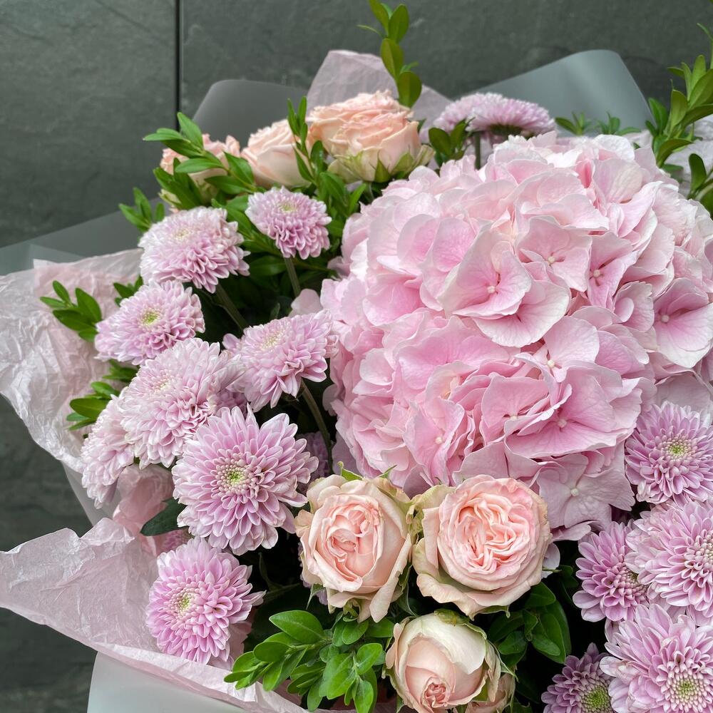 Нежный букет в розовых тонах. Отличное сочетание гортензии и пионовидной розы,с добавлением прекрасной сантини. Легкий воздушный букет станет отличным презентом на любое мероприятие: день рождения,свадьба или же просто коллеге по работе.