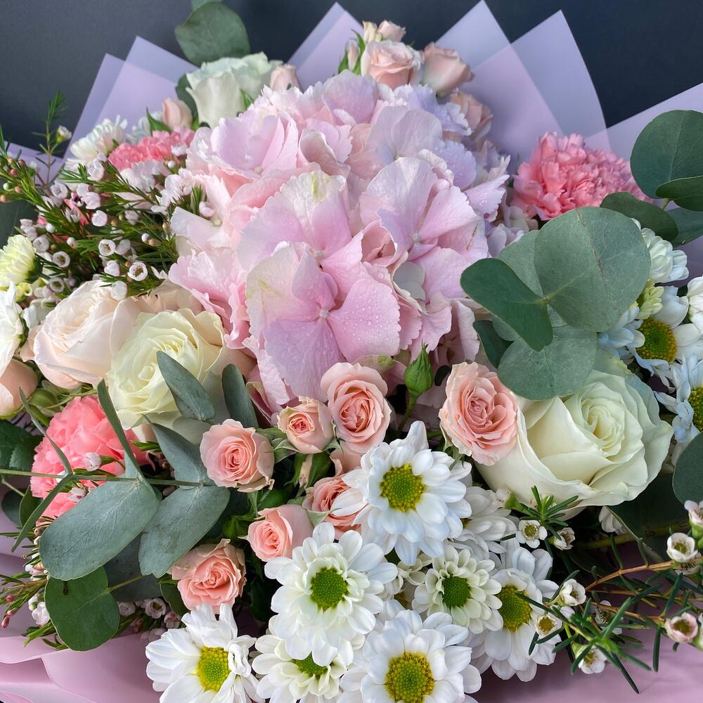Нежный букет в бело – розовых тонах с Гортензией и Розами . Выглядит стильно, воздушно , по-летнему очаровательно и свежо .