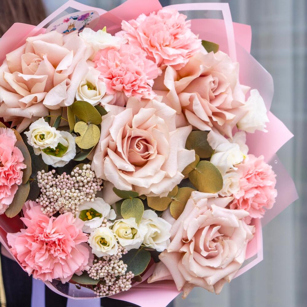 Сборный букет с французскими розами и гвоздикамм в пудровых оттенках