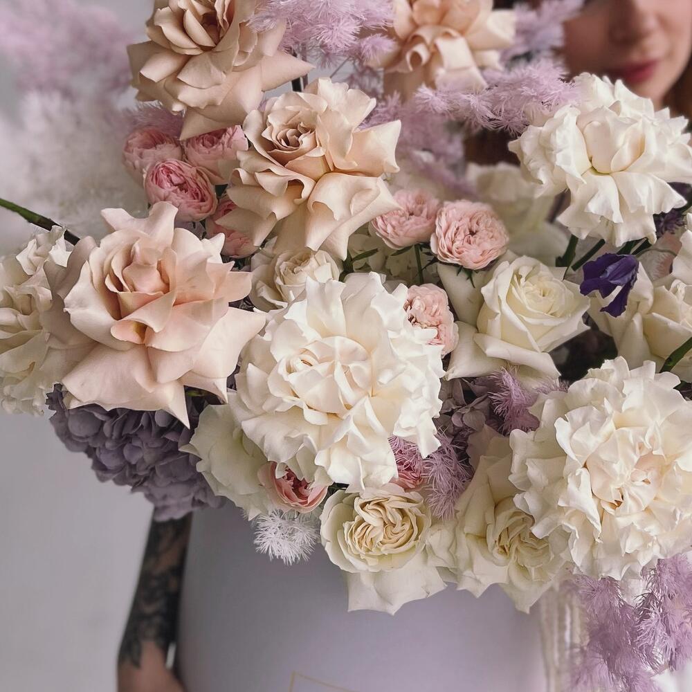 Шляпная коробкаБольшая пышная коробка с цветамиГортензииФранцузская Роза