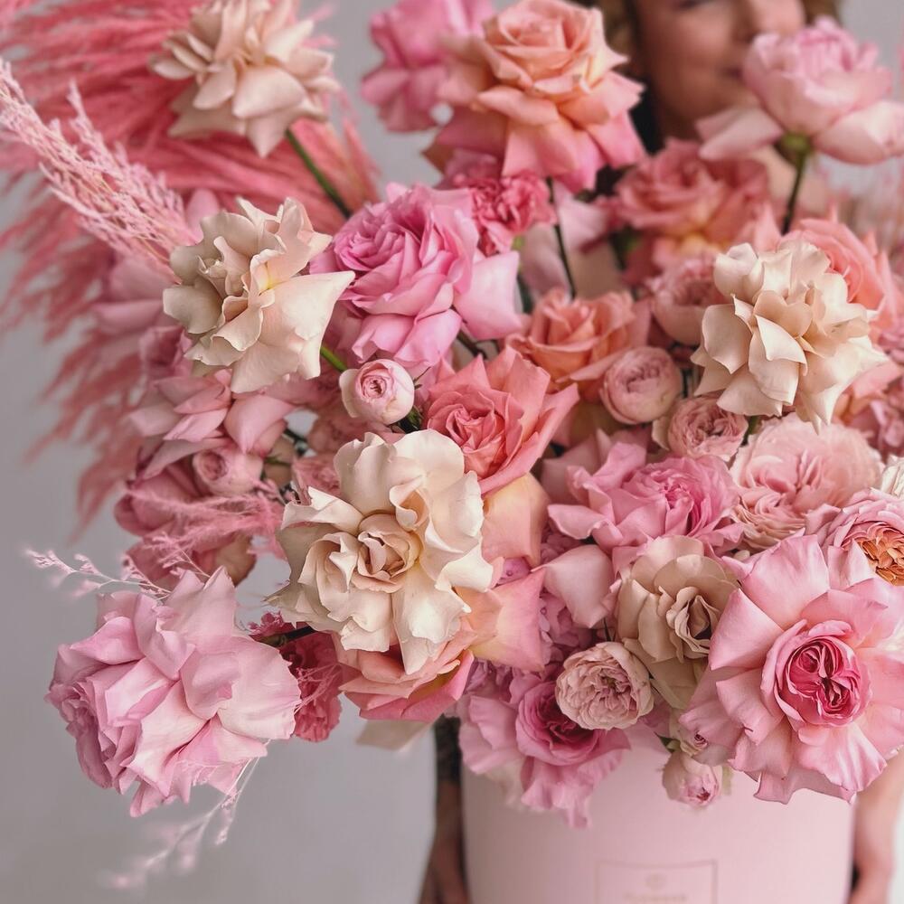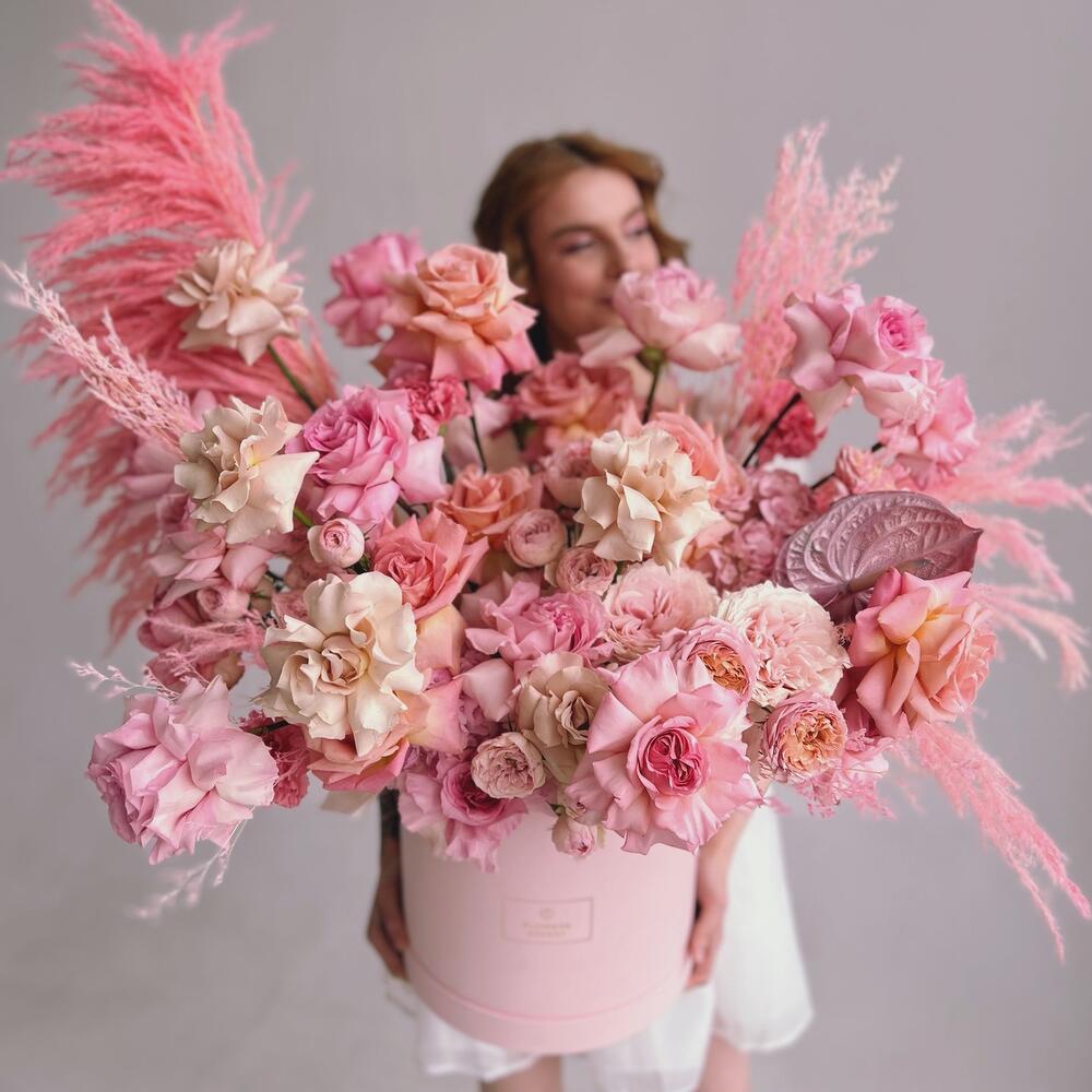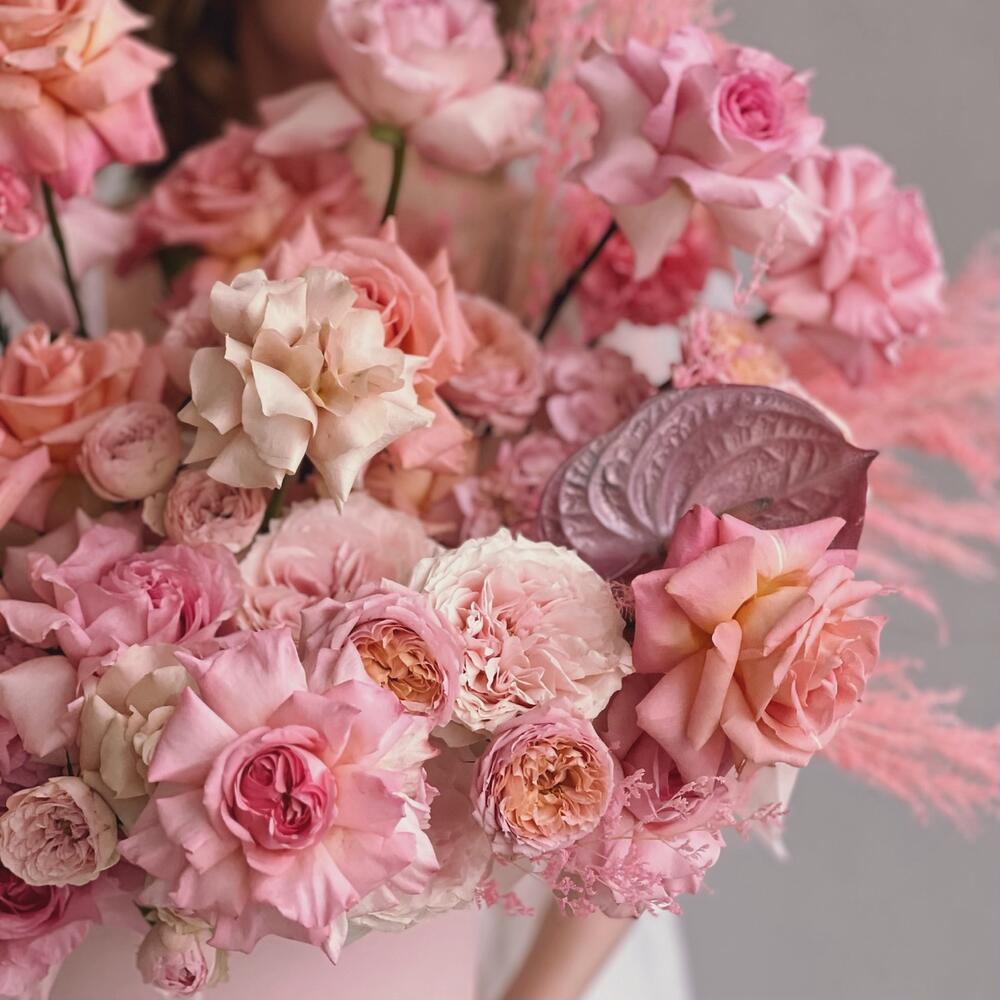 Антуриум – 1 шт.Кустовая роза – 11 шт.Сухоцветы – 9 шт.Шляпная коробка – 1 шт.Французская роза – 25 шт.