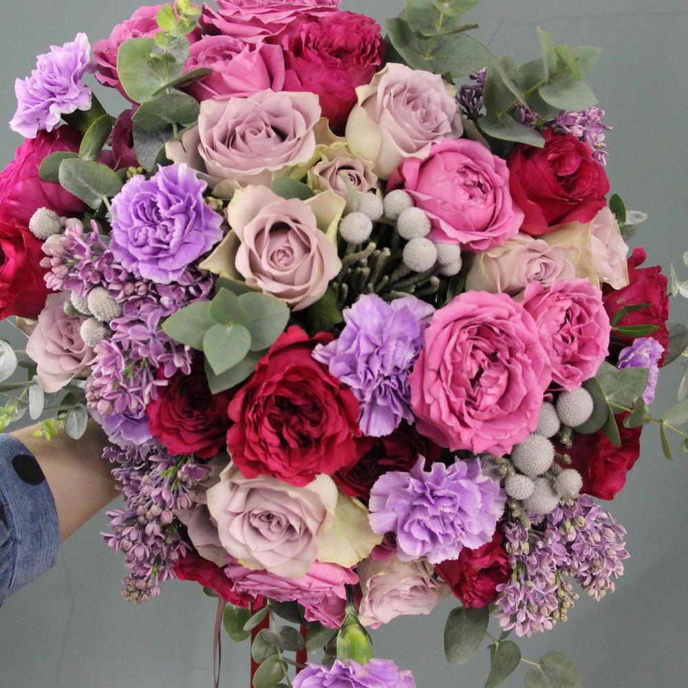 Роскошный букет классической круглой формы, в сиреневых тонах.А составе – сирень, розы пионовидные и эквадорские, бруния, диантус и эвкалипт.Высота букета около 60 сантиметров, ширина букета около 45 сантиметров.Стильное цветочное решение для любого случая.
