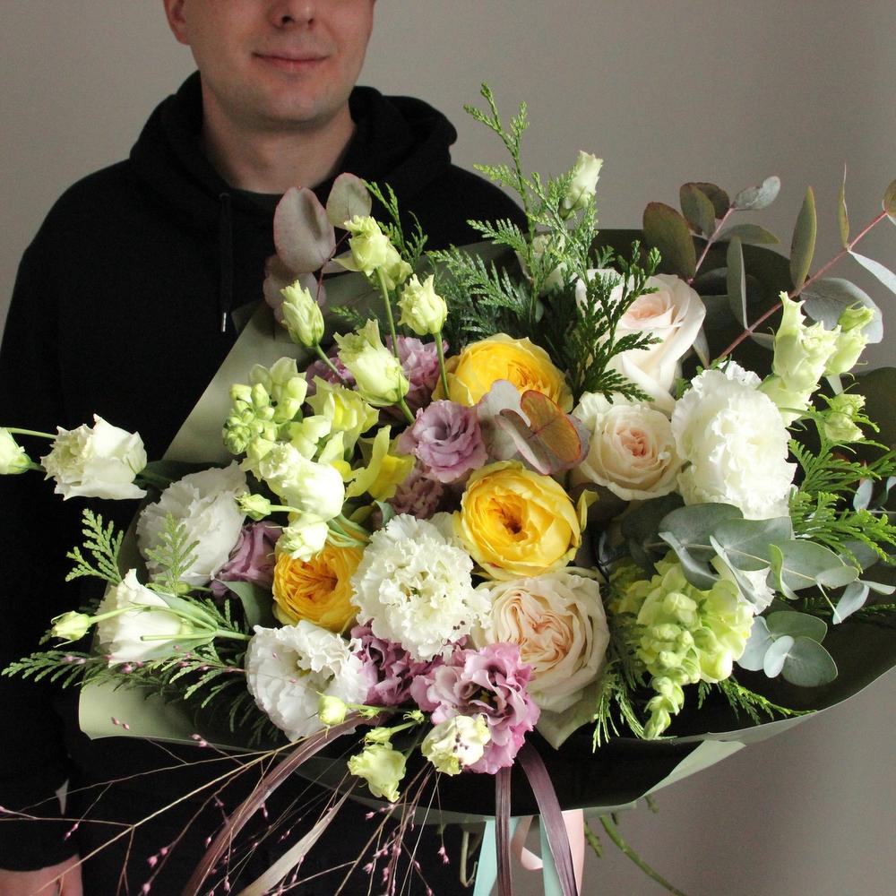 Солнечный, душистый букет с пионовидными розами, львиным зевом, туей, паникумом, лизиантусом и эвкалиптом.Стильное цветочное решение для любого случая.