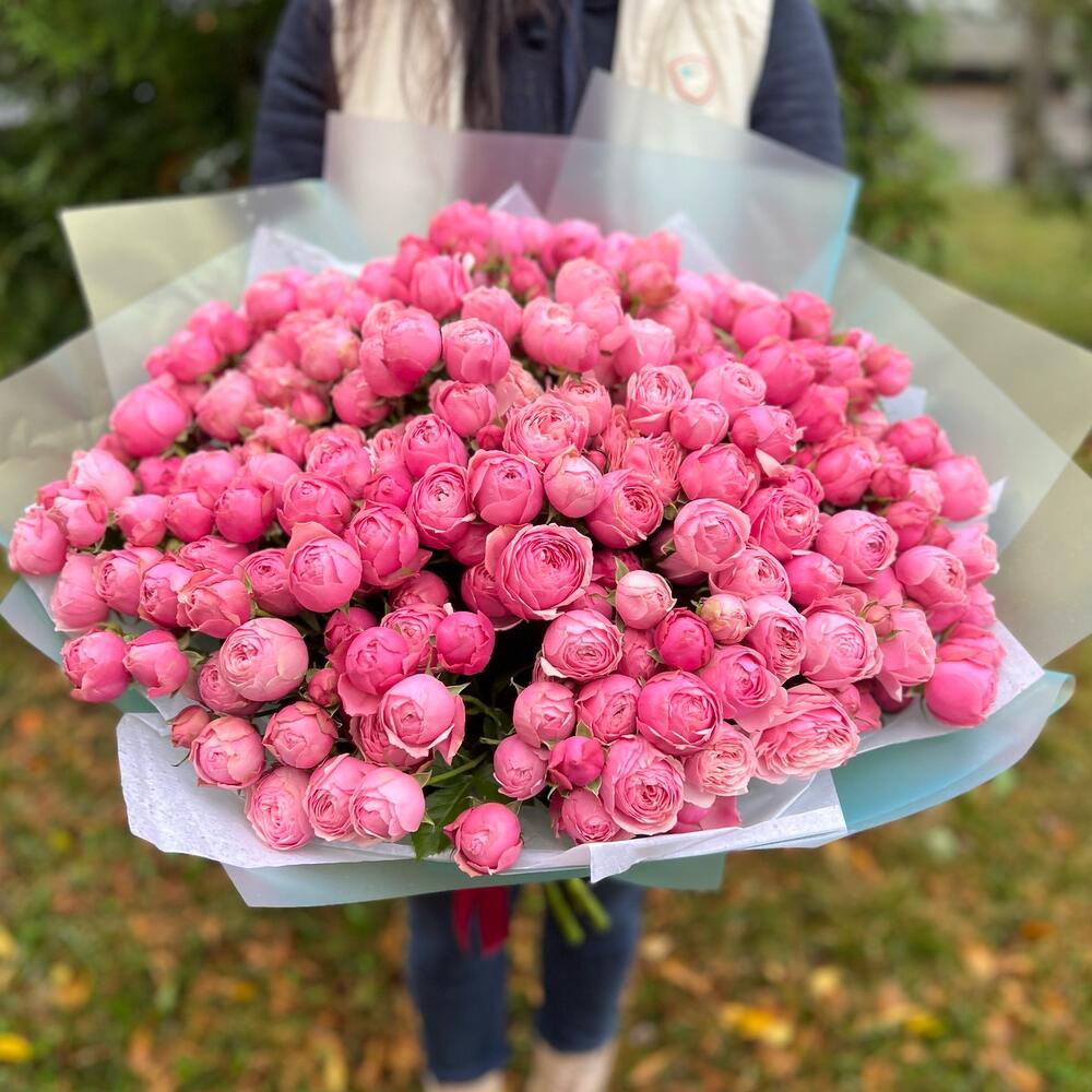 Лента атласная – 2 шт.Тишью – 4 шт.Роза пионовидная кустовая – 51 шт.Пленка матовая – 4 шт.