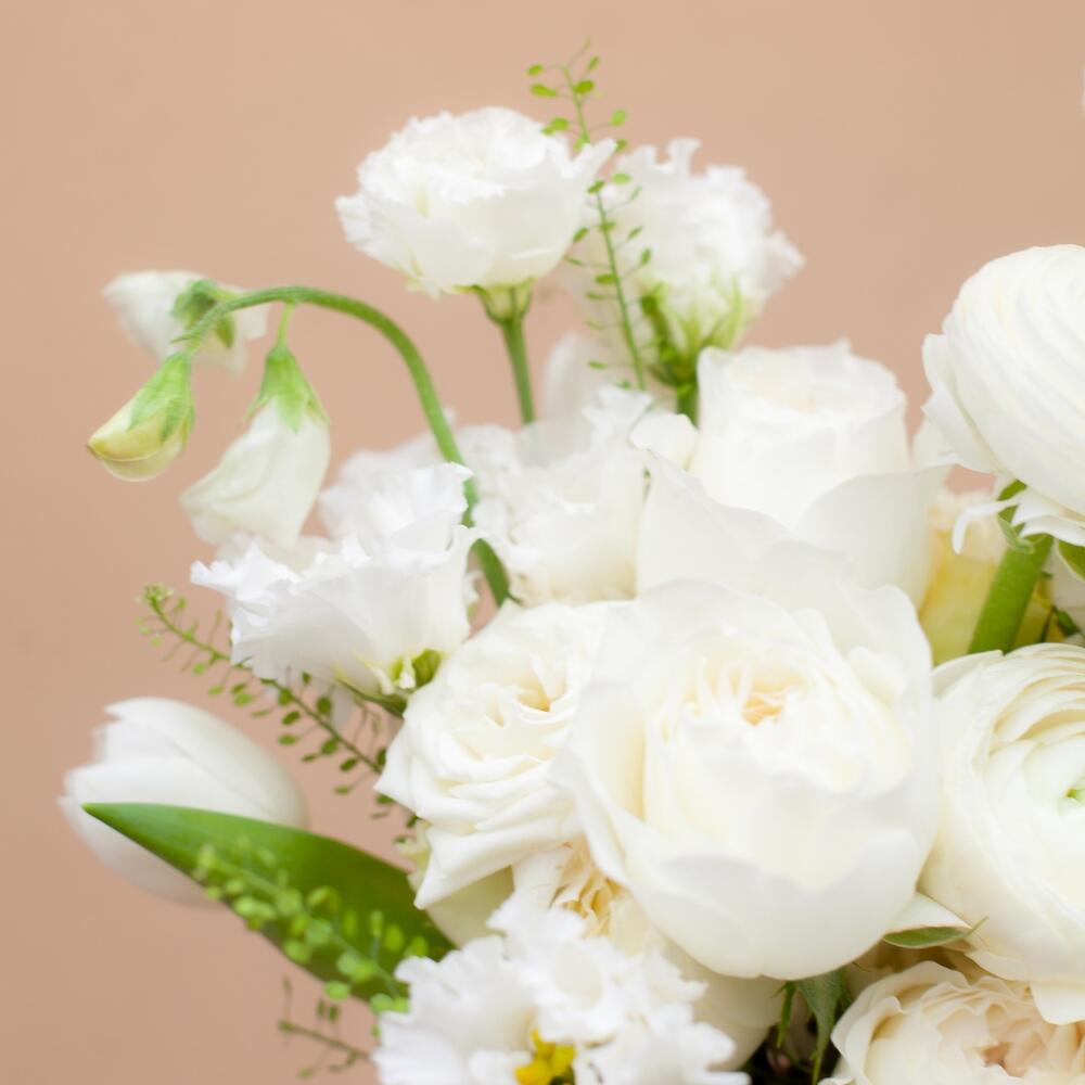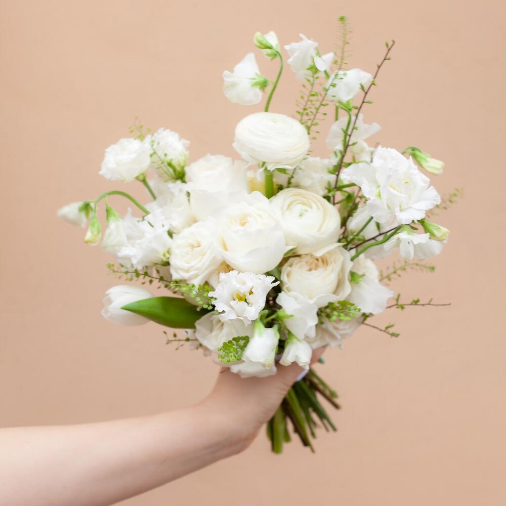 Ранункулюс – 2 шт.Пионовидная роза – 5 шт.Латирус – 7 шт.Лизиантус Алиса белый – 3 шт.гринбелл ветка – 1 шт.Тюльпан белый – 3 шт.Роза кустовая – 2 шт.