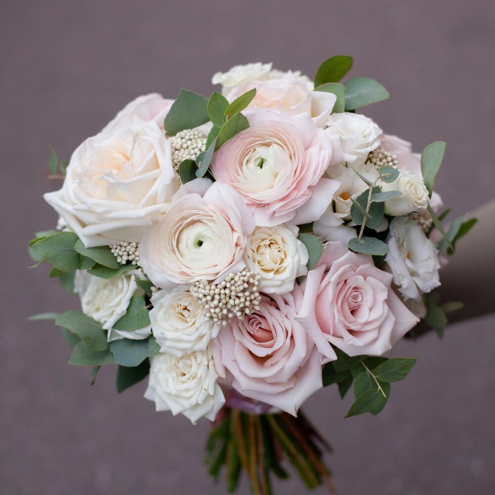 Ранункулюс – 3 шт.Роза пионовидная – 3 шт.Роза – 4 шт.Роза кустовая – 3 шт.Эвкалипт – 7 шт.Озотамнус – 1 шт.