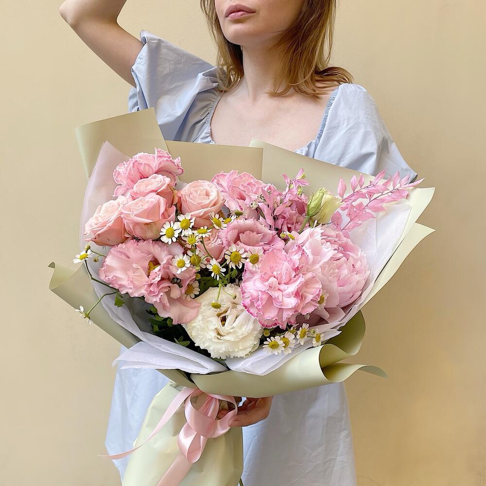 Танацетум – 2 шт.Диантус – 3 шт.Роза кустовая пионовидная – 1 шт.Пион Сара Бернар – 1 шт.Упаковка дизайнерская – 1 шт.Астранция – 2 шт.Лизиантус розовый – 2 шт.рускус стабилизированный – 1 шт.
